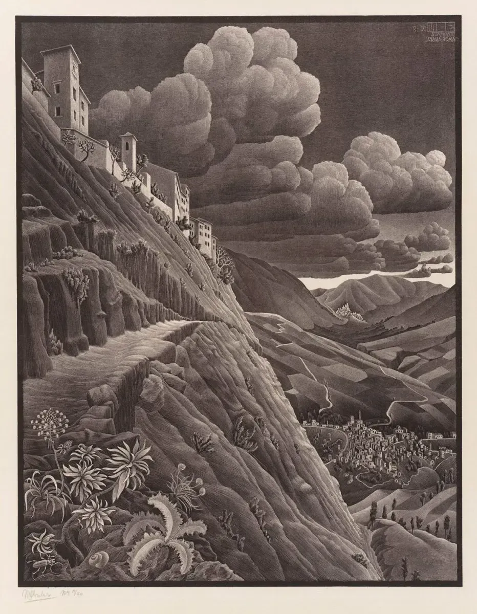 Between 1922 and 1935, Escher lived in Italy. During those years, he traveled extensively through central and southern regions, searching for dramatic landscapes and medieval architecture to draw.